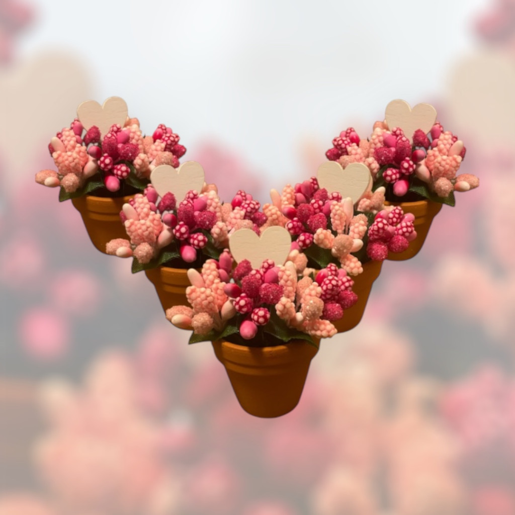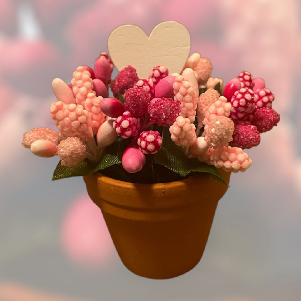 A dekoratív cserépben elhelyezett virágdíszeket egy kedves szív teszi még meghittebbé.