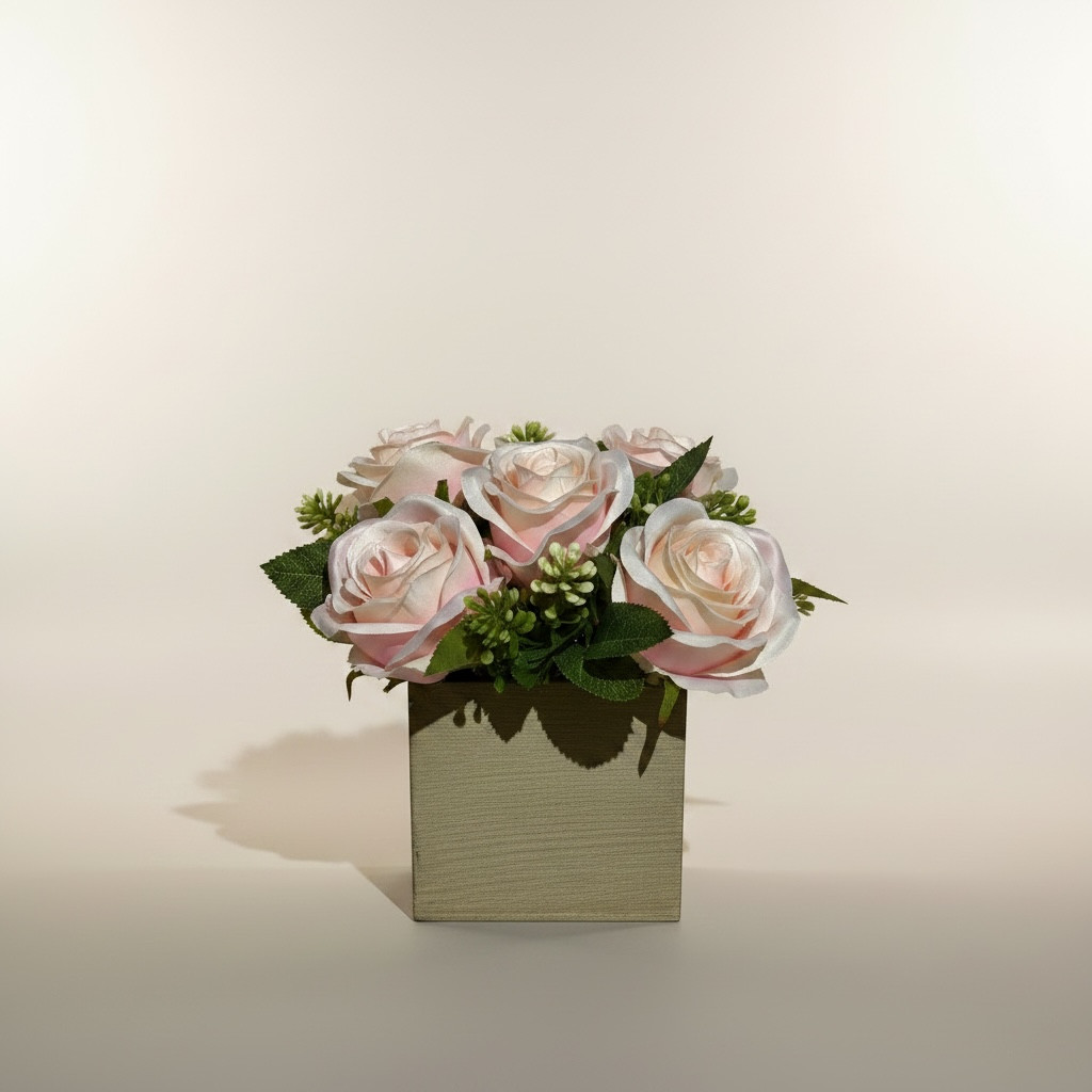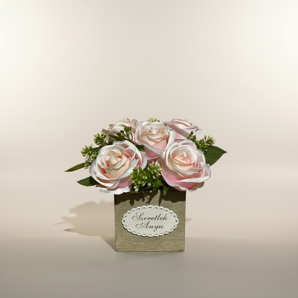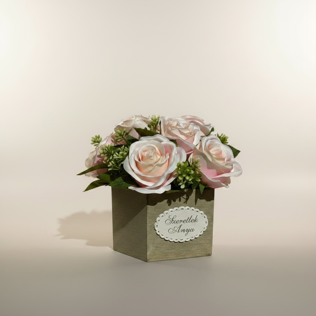 A finom rózsaszín rózsák és a természetes hatású zöld dekoráció harmonikus összhangban díszítenek egy elegáns fa dobozt, amelyen a szeretetteljes felirat teszi igazán különlegessé ezt az ajándékot.