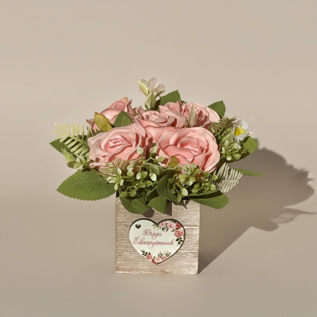 Lepd meg édesanyádat egy igazán különleges és maradandó ajándékkal! Ez a kézzel készült anyák napi virágbox elegáns rózsaszín virágokkal és természetes hatású zöld dekorációval készült, egy stílusos fa dobozba rendezve.